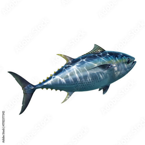 © Gradix Studio, Naklejka premium A stunning yellowfin tuna, a large and powerful fish known for its streamlined body and vibrant colors, isolated on transparent background it is a prized catch