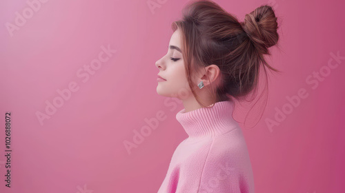 © ChimE, Fototapeta premium A stunning young woman poses gracefully with a casual bun, exuding confidence and charm against a pink backdrop.