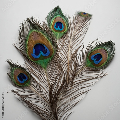 © Khalid, Obraz premium "A stunningly colorful peacock feather pattern over a minimalist white backdrop."