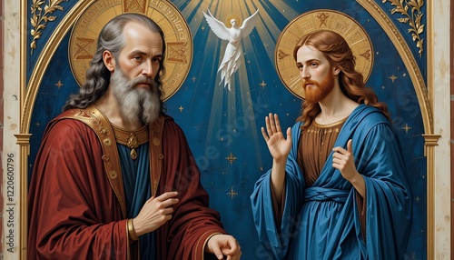 © PixelFrame, Naklejka premium A stunningly detailed religious artwork depicting Jesus Christ and an aged apostle, bathed in divine light and surrounded by ornate gold frames.
