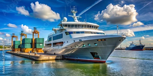 Naklejka premium A sturdy, high-performance vessel with sleek design and advanced navigation systems, docked at a bustling harbor, ready