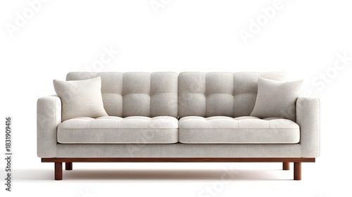 © pkproject, Obraz premium A stylish and comfortable tufted beige fabric sofa featuring plush seat and back cushions two throw pillows and a simple wooden frame with tapered legs perfect for modern interiors