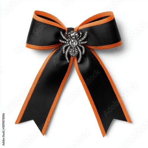 Fototapeta premium A stylish black and orange bow featuring a decorative spider brooch, perfect...