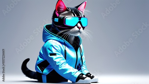 © darion, Obraz premium A stylish cat wearing sunglasses and a hoodie, exuding a cool, futuristic vibe.