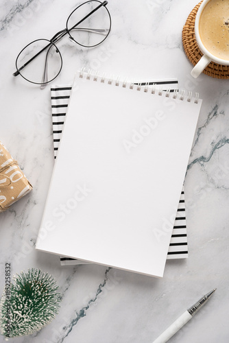© ActionGP, Obraz premium A stylish desk setup featuring a blank notebook on top of striped paper, glasses, a cup of coffee, a small wrapped gift, and seasonal decorations, perfect for holiday planning and creative work