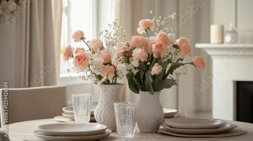 © Pannee, Fototapeta premium A stylish dining table set with Peach Fuzz floral centerpieces in neutral vases.