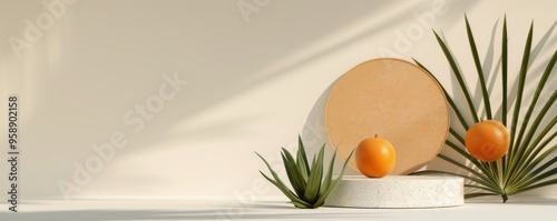Fototapeta premium A stylish display featuring oranges, a circular backdrop, and tropical...