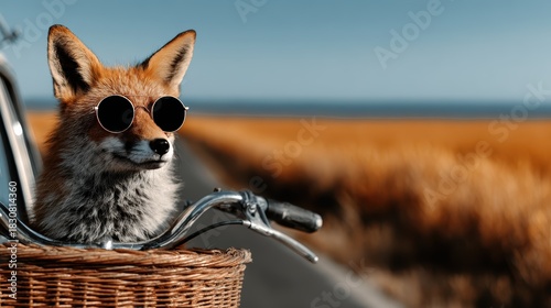 Naklejka premium A stylish fox wearing sunglasses enjoys a scenic bike ride in a rural...