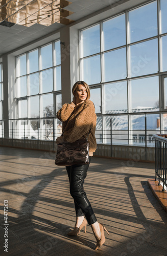 Fototapeta premium A stylish girl in a brown sweater, black pants with a large women's bag poses against the background of large windows.