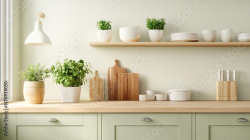 © Ronnayut, Fototapeta premium A stylish green kitchen featuring Scandi design influences.