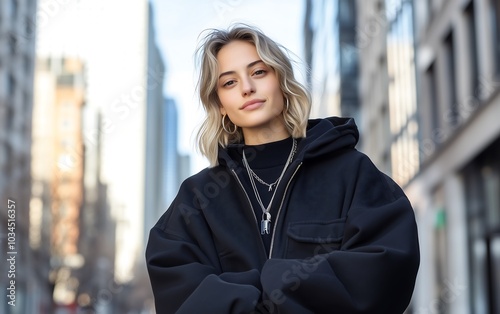 © Mavita, Fototapeta premium A stylish individual poses confidently in an urban setting, wearing a black oversized jacket and layered accessories against a backdrop of city buildings.