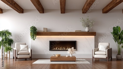 Fototapeta premium A stylish living area showcases a modern fireplace, cozy chairs, and a coffee table, creating a warm and inviting atmosphere
