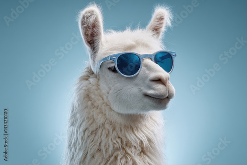 Fototapeta premium A stylish llama wearing blue sunglasses against a soft blue background,...