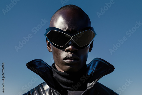 © Fxquadro, Fototapeta premium A stylish man, wearing a sleek black jacket and sunglasses, gazes up at the bright sky with cool confidence, his leather goggles adding a touch of intrigue to his outdoor look