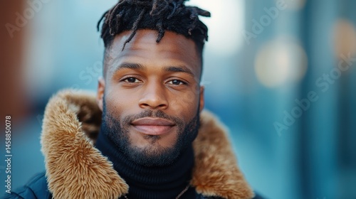 © senadlife, Fototapeta premium A stylish man with dreadlocks and a warm smile stands confidently in a thick winter coat, embodying urban fashion amidst a blurred city backdrop, radiating charisma.