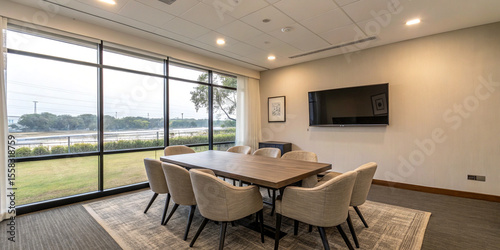 © Muhammad, Naklejka premium A Stylish Meeting Interior with a Table and Armchairs and a TV Screen for Collaboration