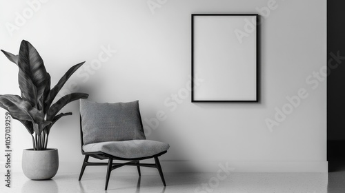 © KAMOSTOCK, Fototapeta premium A stylish, minimalist interior featuring a patterned chair, a plant, and a blank frame on a light wall, emphasizing a modern aesthetic.