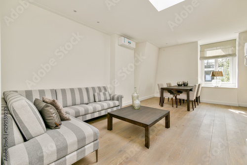 Fototapeta premium A stylish minimalistic living room featuring striped sofas and a wooden...
