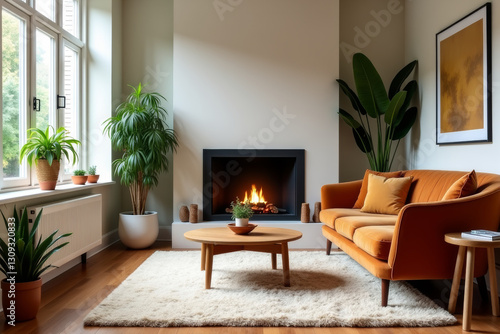 Fototapeta premium A stylish modern mid-century living room with warm tones and minimalist decor .