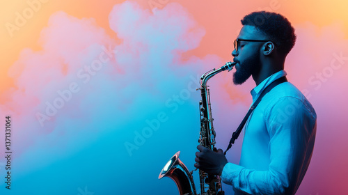 Fototapeta premium A stylish musician plays the saxophone against a vibrant, colorful background, embodying the essence of jazz and creativity.