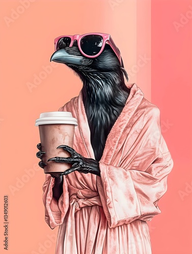 © yulikolibrik, Obraz premium A stylish raven wearing pink sunglasses and a robe, holding a coffee cup against a soft pink background, creating a humorous and surreal aesthetic.