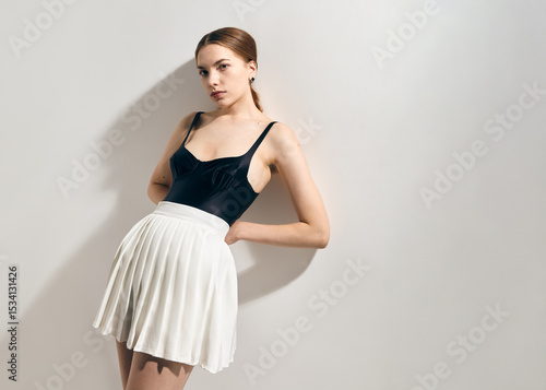 © Angelina Zhuravleva , Naklejka premium A stylish woman in a tennis skirt and black bodysuit poses leaning against a wall