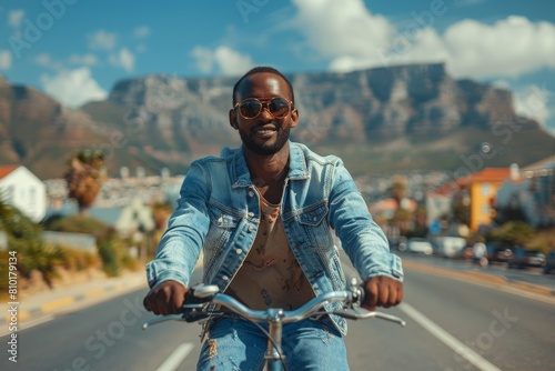 Fototapeta premium A stylish young man enjoys a bike ride with the iconic Table Mountain in the background, showcasing urban exploration