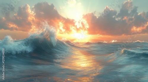 Fototapeta premium A stylized artwork featuring golden waves and clouds against a metallic...