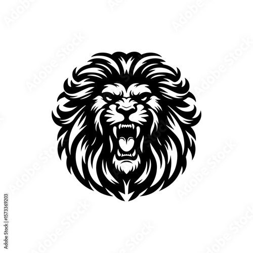 © animardiani, Fototapeta premium A stylized black and white illustration of a roaring lion's head.