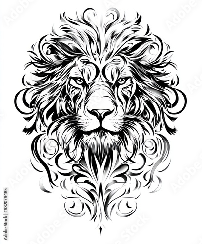Obraz premium A stylized black and white lion's head with intricate floral patterns.