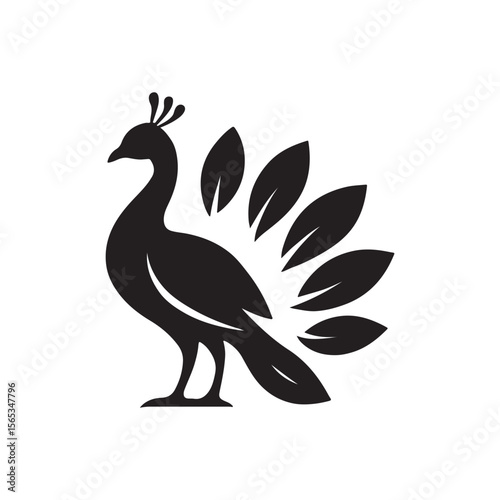 © AL, Fototapeta premium A stylized black peacock with leaf shaped tail feathers on a white background
