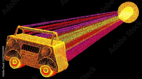 Naklejka premium A stylized, cartoon-like cassette player emitting sound waves as multicolored lines against a black background