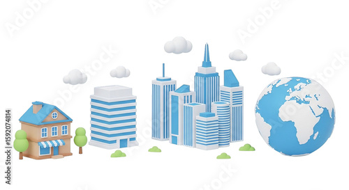 Obraz premium A stylized cartoon world featuring buildings, a house, and a blue and white globe design.