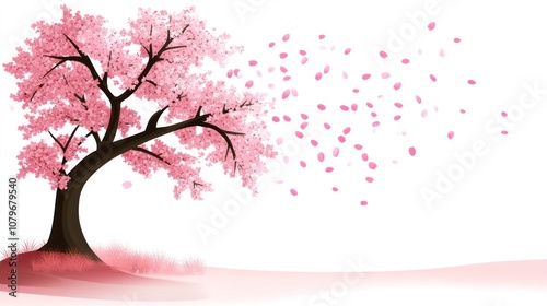 Fototapeta premium A stylized cherry blossom tree with pink petals blowing in the wind against a...