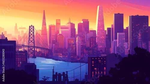 © sungedi, Fototapeta premium A stylized cityscape at sunrise.