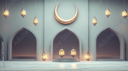 Fototapeta premium A stylized crescent at the top of a minimalist Ramadan card, with glowing lanterns floating below and subtle gray arches in the background.