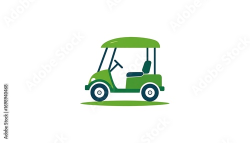 © Elon, Fototapeta premium A stylized depiction of a golf cart, rendered in vibrant green and dark accents, positioned on a grassy plain against a plain white background.