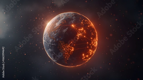 Obraz premium A stylized Earth with glowing cities connected by lines illuminates the...