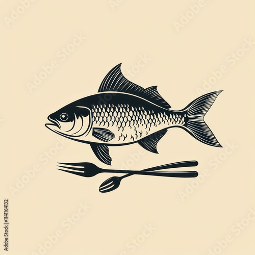 Fototapeta premium A stylized fish illustration accompanied by a fork and knife, symbolizing...