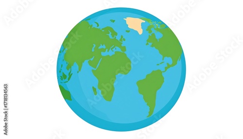 Naklejka premium A stylized globe, displaying continents in simple green and light blue hues, set against a pure white background.