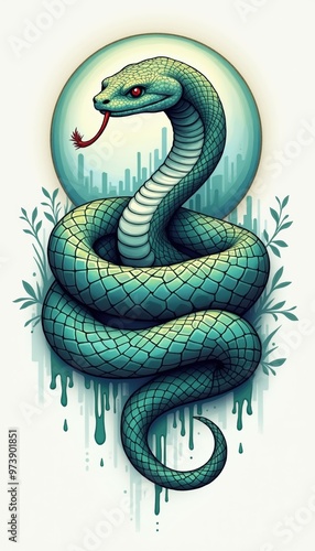 © Makaron, Obraz premium A stylized green snake encircles itself, adorned with foliage and a subtle drip effect, perfect for branding, tattoo design, or eco-themed graphics.