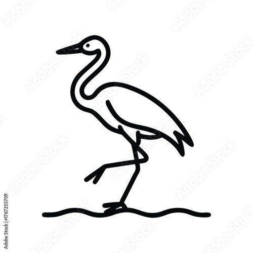 © Neko funny, Obraz premium A stylized heron stands in shallow water depicted with bold lines. Line icon style editable stroke