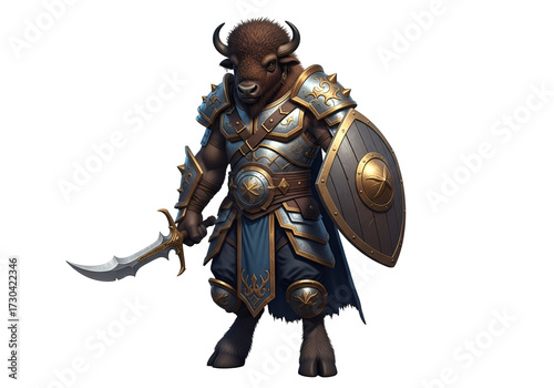 © Putra, Naklejka premium A stylized illustration of a bison warrior, clad in detailed plate armor, holding a curved sword and shield.