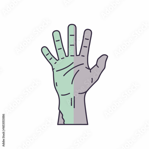 Obraz premium A stylized illustration of a decaying zombie hand with an open palm, split into two colors.