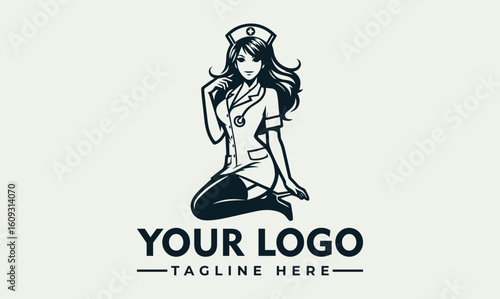 © nuaari, Naklejka premium A stylized illustration of a female nurse kneeling with a friendly pose.
