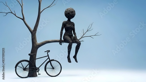 Obraz premium A stylized image of a figure composed of wrapped black material sits on a tree branch, positioned in the upper center of the frame. The figure, seemingly genderless and ageless, has a spherical head a