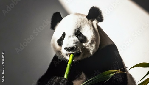 © patsai, Naklejka premium A stylized image of a panda with a few bold strokes, focused on eating a simple green bamboo shoot, against a clean, white background for contrast.