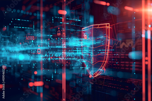 Fototapeta premium a stylized image representing developer cybersecurity featuring elements such as a shield a lock and lines of code in the background