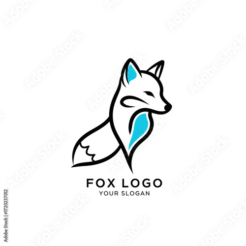 © Yahya, Fototapeta premium A stylized minimalist fox logo design featuring a sitting fox with black outlines and bright blue accents.
