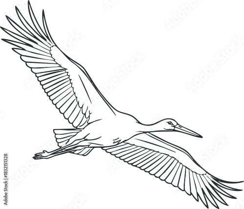 Fototapeta premium A stylized outline illustration of a flying crane bird in minimalist black...